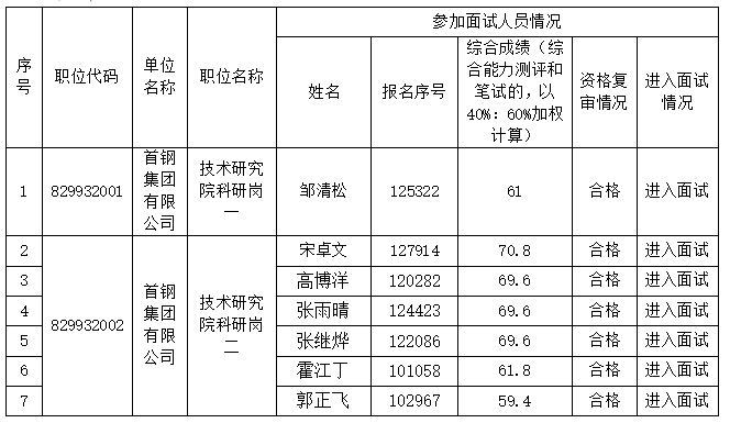 按照北京市2026年度“优培计划”招聘应届优秀大学毕业生工作总体部署要求和首钢集团的整体安排,首钢集团有限公司技术研究院已组织完成了综合能力测评、笔试和资格复审工作,初步确定了进入面试人选,现将有关情况公布如下: