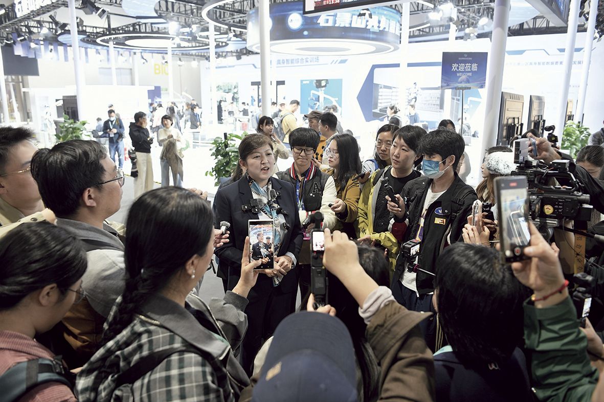 探访活动现场,记者“采访”了人形机器人主持人“幻幻”。从虚幻走向现实的“幻幻”好像在说:“我是中国科幻大会和首钢园的老朋友了。”2023、2024中国科幻大会的“幻幻”还只是屏幕上的虚拟主持人。2025年,“幻幻”通过“飞行器”来到2025中国科幻大会开幕式现场,与主持人共同完成首次公开互动演示。今年,“幻幻”变身双足仿生机器人,向现实“进一步走来”,可以独立进行主持。“幻幻”无需多言,“进化”的本身正是首钢园打造科幻沃土、书写“未来之问”的最好答案。
