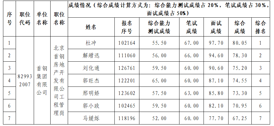 按照北京市2026年度“优培计划”招聘应届优秀大学毕业生工作总体部署要求和首钢集团的整体安排,北京首钢房地产开发有限公司已完成了综合能力测试、笔试、资格复审和面试工作,现将成绩予以公布如下。