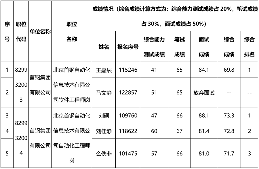 按照北京市2026年度“优培计划”招聘应届优秀大学毕业生工作总体部署要求和首钢集团的整体安排,北京首钢自动化信息技术有限公司已完成了综合能力测试、笔试、资格复审和面试工作,现将成绩予以公布如下。