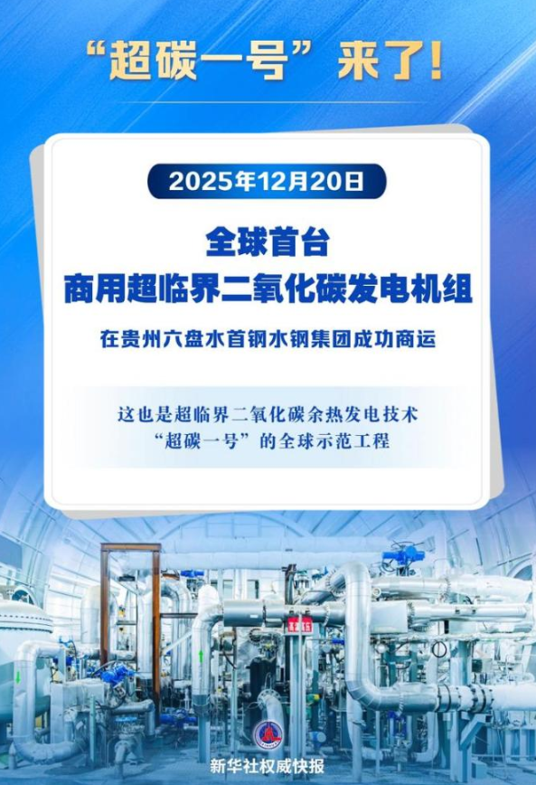 发布时间:2025-12-23二氧化碳也能用来发电了?12月20日,全球首台商用超临界二氧化碳发电机组在贵州六盘水成功商运,这也是超临界二氧化碳余热发电技术“超碳一号”的全球示范工程,成为发电技术的进步例证。