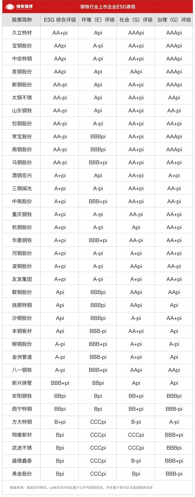 绿发信评主动评级结果显示,在35家钢铁企业中,久立特材获AA+pi评级,宝钢股份、中信特钢和首钢股份获得AApi评级,新钢股份、太钢不锈、山东钢铁、包钢股份、常宝股份、南钢股份和马钢股份获AA-pi评级,行业头部企业整体表现较好。
