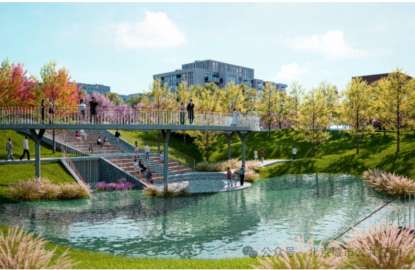 北侧五个地块作为人民渠规划的蓄涝区,设计方案深度协同防洪要求,将其塑造为“平急两用”的动态雨洪空间。