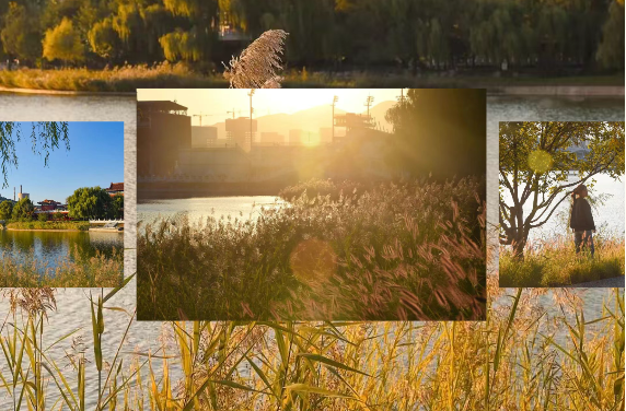 沿岸垂柳与雪松倒映湖中,秋日芦苇如金色波浪随风起伏,远眺滑雪大跳台与石景山层林尽染,随手一拍即是大片。