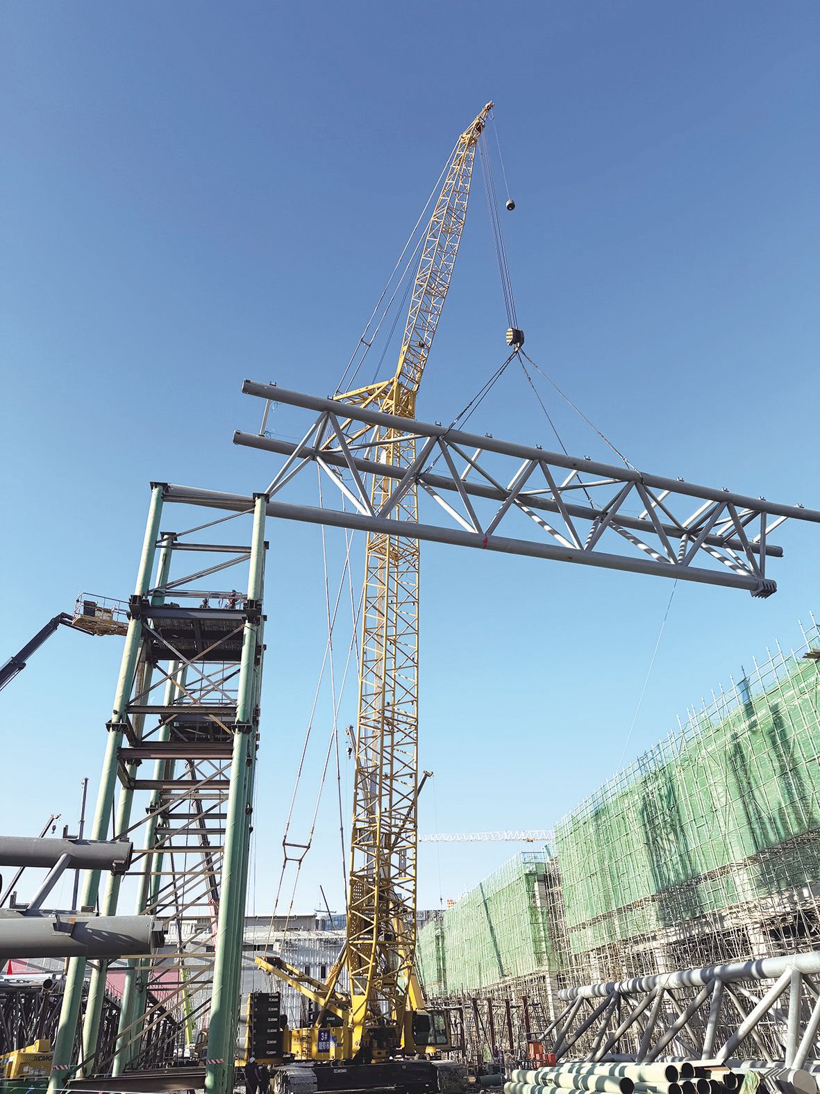 本次吊装的主桁架单榀整体高度7.5米、宽度4.7米、长度107米、重量达215吨,具有跨度大、杆件数量多、节点受力复杂、安装精度要求高、高空作业难度大等难点。首钢城运从构件加工制造到现场拼装再到整体吊装,全过程面临极高的质量控制和技术组织要求,在确保施工安全与精度的前提下,大力提高施工场地周转效率,现场采用分段式吊装工艺,严格控制构件加工与拼装精度、临时支架搭设精度及吊装轴线和高程偏差,并对吊车摘钩和卸载阶段的桁架轴线及高程变化进行实时监测,保障结构受力安全可控。